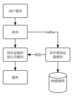 说明:网关增加设备校验公共子模块,网关请求通过kafka消息异步校验设备号是否存在、是否注册,异步结果同步给网关设备校验公共子模块。