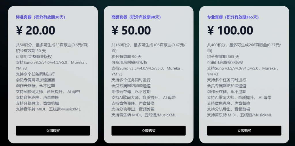 Suno 采用积分制收费模式,5积分可创作两首完整歌曲,支持商业版权。