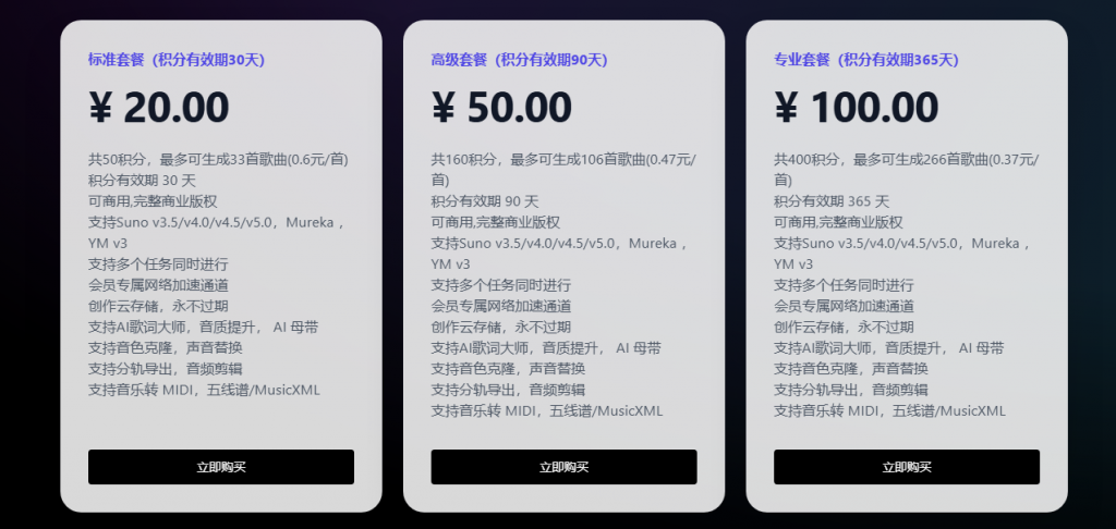 支持Suno v3.5/v4.0/v4.5/v5.0,Mureka ,YM v3。 - 100元400积分:最多可生成33首歌曲(0.6元/首)