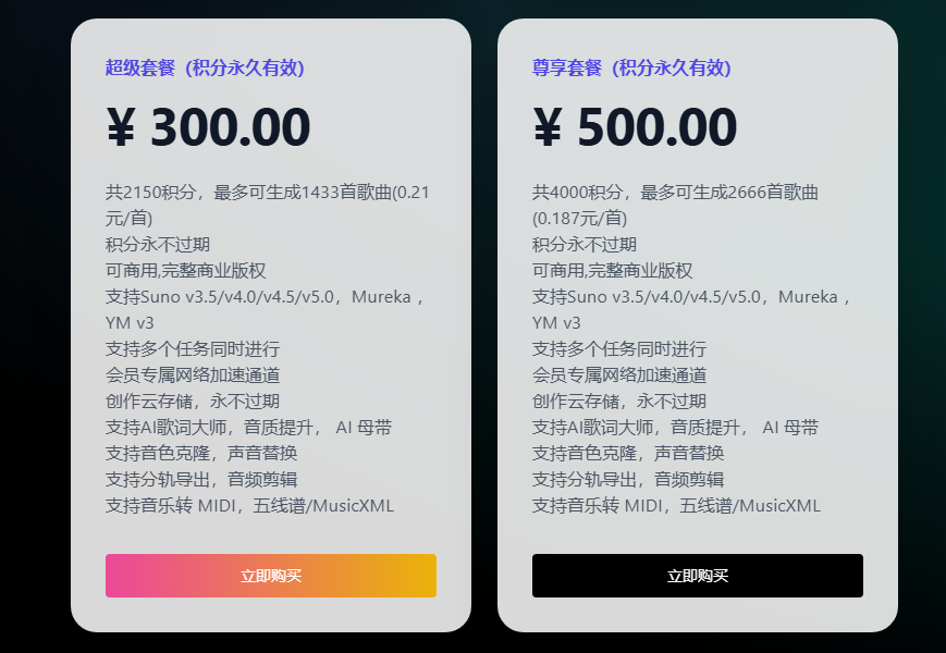 支持Suno v3.5/v4.0/v4.5/v5.0,Mureka ,YM v3。 - 500元4000积分:共4000积分,最多可生成2666首歌曲(0.187元/首)