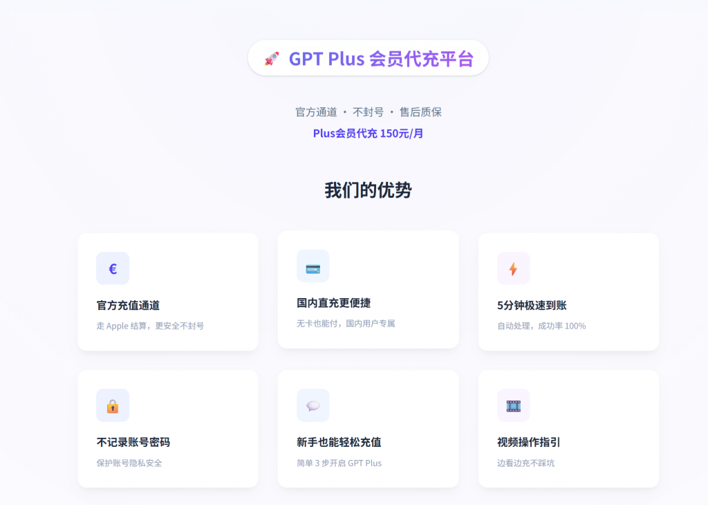 相比于官方直付(例如用美金支付、经常因为支付失败导致重复扣费),gptsvip.com 平台的卡密价格明显更接地气,150 元人民币左右即可开通一月 GPT Plus 会员权益,性价比非常适合国内用户。